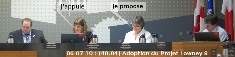 Borough Council of June 1st, 2010 Councillor Fournier: citizens are invited to continue discussing their concerns about the project with the council since it is not yet adopted in its final version Mayor Dorais: this project will not be accelerated and it is important to continue to improve projects so that they meet the expectations of citizens. Source: Procès-verbal p.4 |
