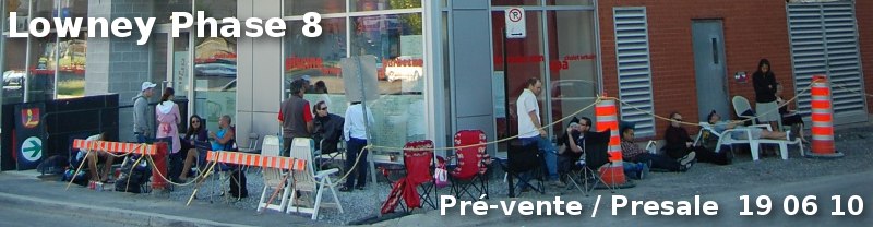 Le 19 juin, 2010, la pré-vente du Lowney Phase 8 a commencé avec les clients les plus anxieux attendant en ligne depuis 17h la veille. Développeur Prével avancent le projet malgré le fait que les changements de zonage que ceci nécessite n'étaient pas encore approuvés par l'arrondissement. En trois heures, 109 des 129 unités ont été réservés. | On June 19th, 2010, the Lowney Phase 8 presale began with potential clients lining up beginning at 5pm the evening before. Developer Prével moved ahead with the project despite the fact that the changes in zoning that it required had not yet been approved by the borough. In three hours, 109 of the 129 units were reserved. | |