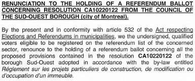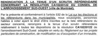 Les 277 signatures représentent plus que 50% des personnes habiles à voter dans le secteur. Par contre, dans l'éléction municipale de 2009, seulement 36.32% des personnes habiles ont voté dans le Sud-Ouest (p. 375). Donc il y a plus qu'un tiers plus de gens qui renoncent leur droit de voter plutôt que de l'exercer ! | The 277 signatures represent more than 50% of eligible voters in the sector. In contrast, only 36.32% of eligible voters in the Sud-Ouest took part in the 2009 municipal election (p. 375). Therefore, there are more than one-third more people prepared to renounce their vote rather than exercise it! According to the Quebec Municipal Affairs Department, renunciations are not intended for the benefit of private developers: Developers exploiting legal loophole Linda Gyulai, The Gazette (04 08 10) | |