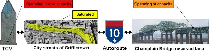 During rush hours, one bus would have to pass every 15 seconds in each direction in order to satisfy demand. The same is true for BRT. Since the Champlain Bridge reserved lane is already operating at capacity, and the TCV above capacity, any bus solution is limited in scale. |